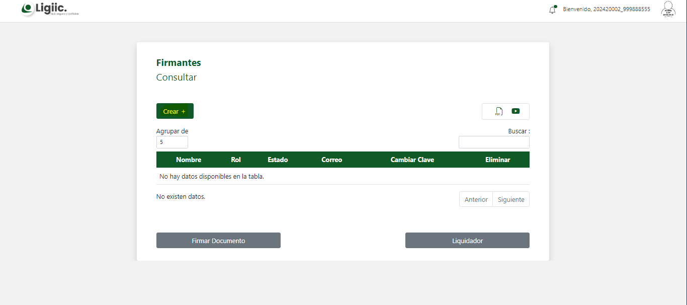 "Crear" : Cuando aun no haz registrado ningún firmante